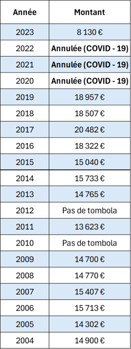 Et cela d'autant plus que notre tombola annuelle, principale source de revenue depuis des années, au même titre que les dons, s'est vue arrêtée pendant 3 années en raison de l'épidémie internationale liée à la COVID-19 !